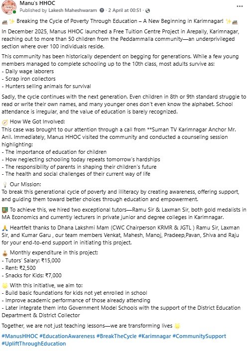 Fee payment- Manus HHOC tuition center students in Pvt School-Feb 2026
