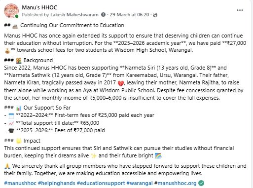 Fee payment- Manus HHOC tuition center students in Pvt School-Feb 2026